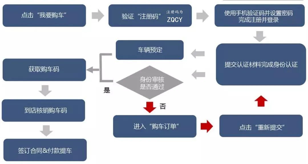 A:点击“我要购车”进行注册码验证(注册码为中企诚谊拼音首字母:ZQCY)。验证成功后可通过手机验证码并设置登录密码完成注册并登录。登录成功后客户需选择身份审核方式,选定后填写真实信息,即可预定意向车辆。