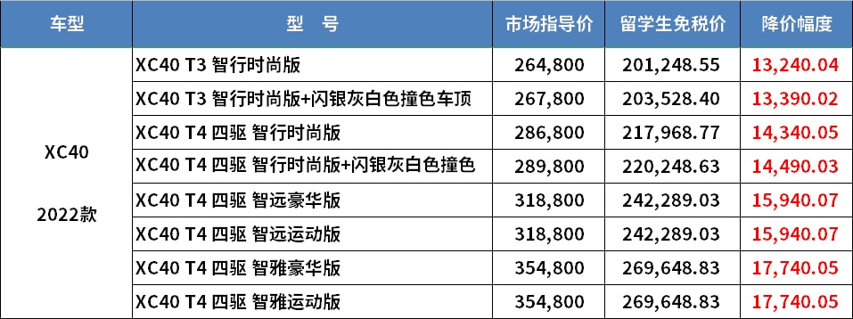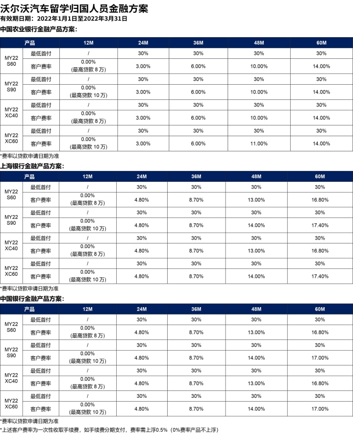 优惠政策:通过中企诚谊身份认证审核的归国留学人员,在沃尔沃授权4S店议价基础上额外尊享购车优惠。适用车型:XC60、S90、S60、XC40、XC90、V90CC(全系,含混动)