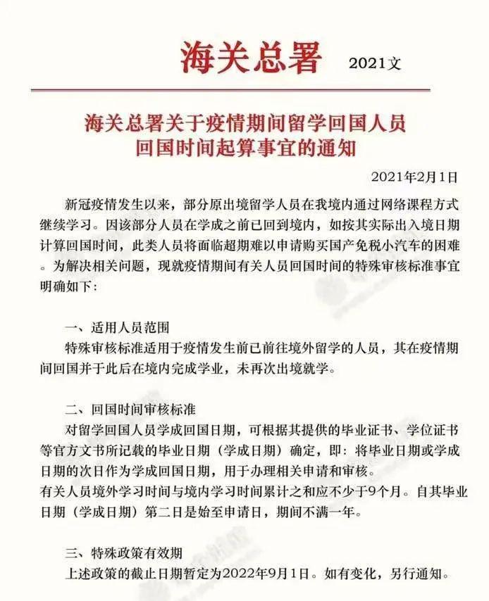 2021年2月海关特殊审批新政:特殊审核标准适用于疫情发生前已前往境外留学的人员,其在疫情期间回国并于此后在境内完成学业,未再次出境就学。回国时间审核标准根据留学人员提供的毕业证书、学位证书等官方文书所记载的毕业日期(学成日期)确定,即:将毕业日期或学成日期的次日作为学成回国日期,用以办理相关申请和审核。有关人员境外学习时间与境内学习时间累计之和应不少于9个月。自毕业日期(学成日期)第二日起1年内申请有效。