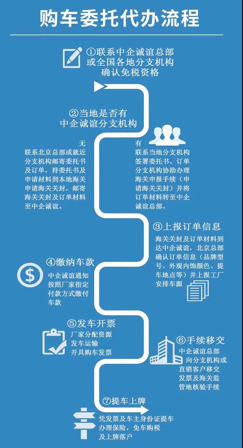 1.联系中企诚谊总部或者当地网点确认购车条件以及材料是否符合要求,并办理主管地海关免税车申报手续;