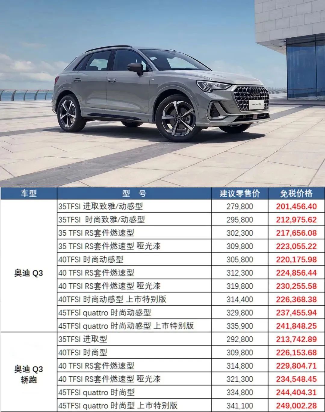 奥迪Q3是一款紧凑型豪华SUV,外观设计精致,人称小兰博基尼Urus,奥迪Q3内饰时尚科技感足。整车配备了高效1.5T和2.0T发动机,匹配7速双离合变速器,提供出色的加速性能和燃油经济性。同时,奥迪Q3还拥有灵活的驾驶性能和宽敞的车内空间,让驾驶者和乘客都能享受到高品质的汽车生活。