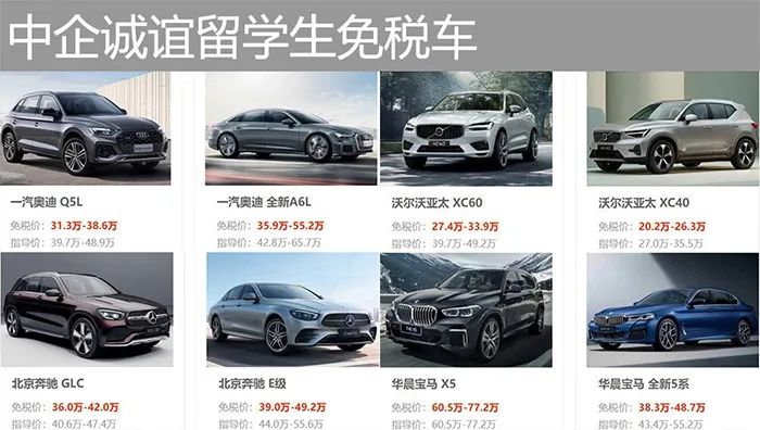 目前在供应的留学生免税车品牌和车型都是根据免税车政策文件,通过了海关备案的的生产企业,才能提供免税车销售,中企诚谊目前拥有全部备案汽车品牌厂家授权,不在中企诚谊免税车供应目录内的车型都是无法办理海关申报的。