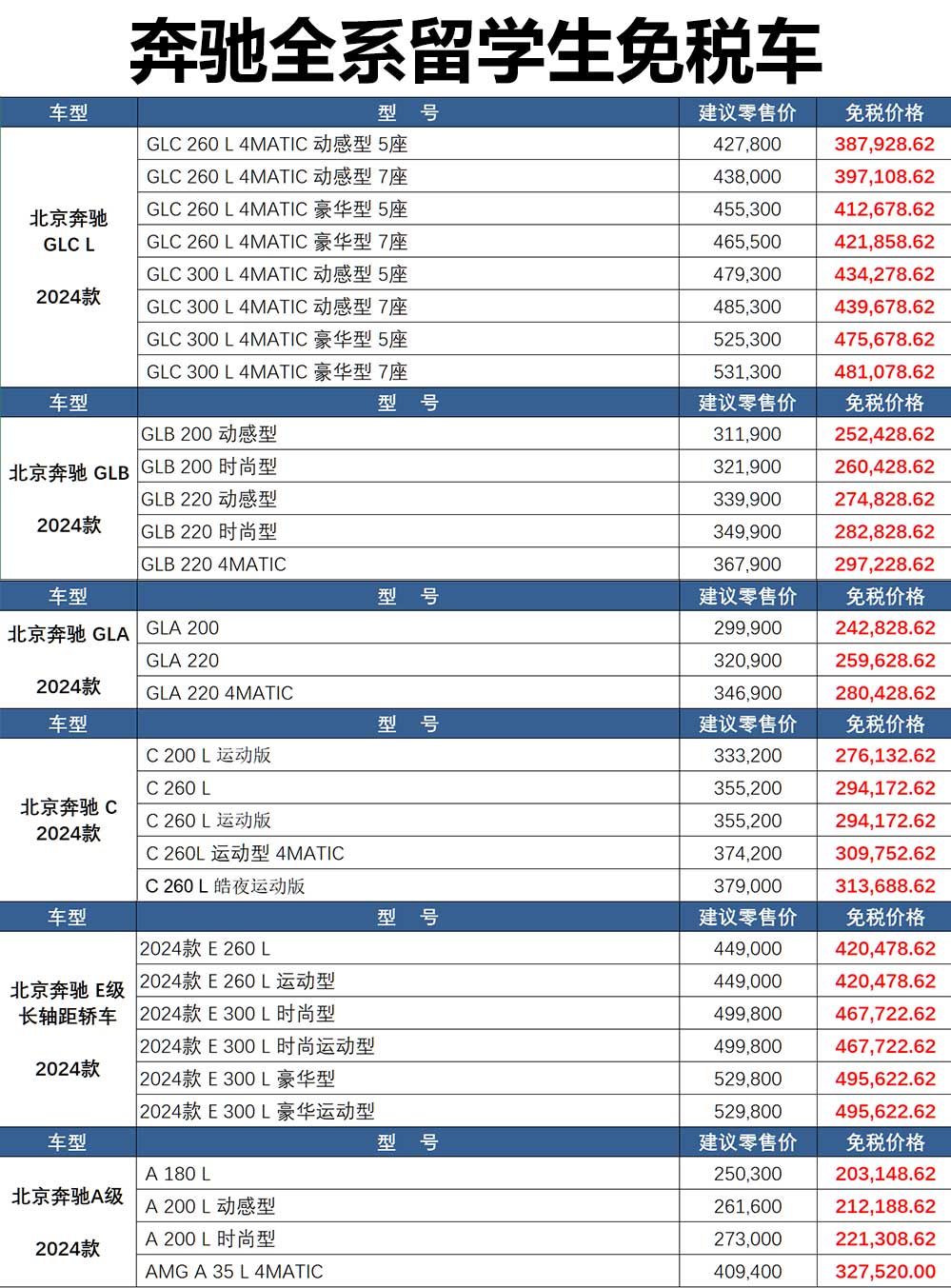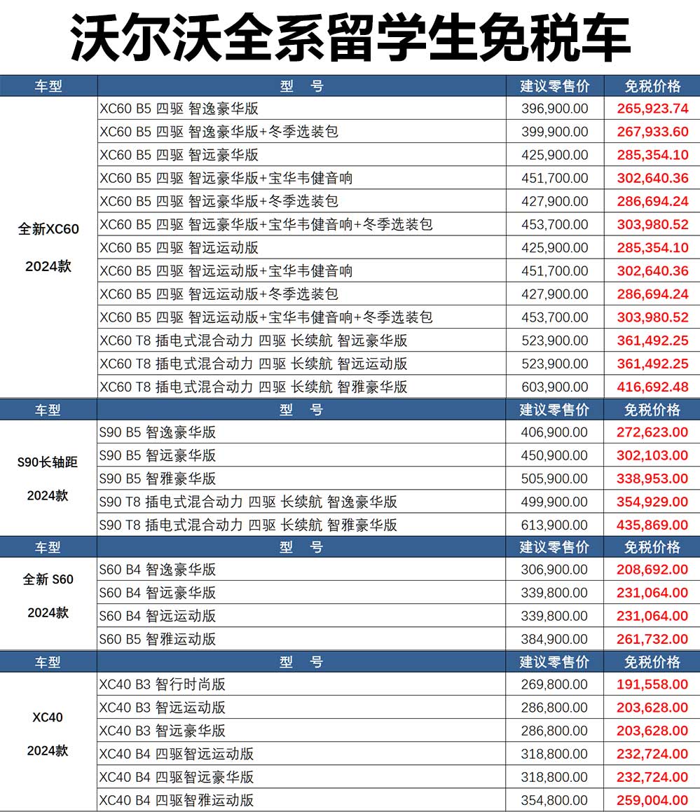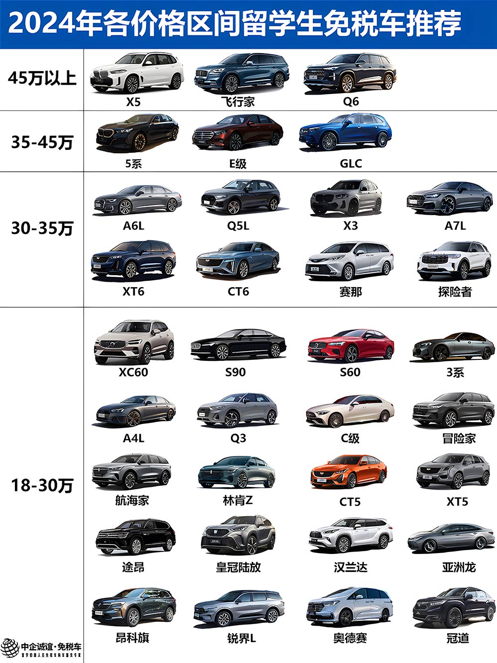 2024年各热门品牌各价格区间留学生免税车推荐