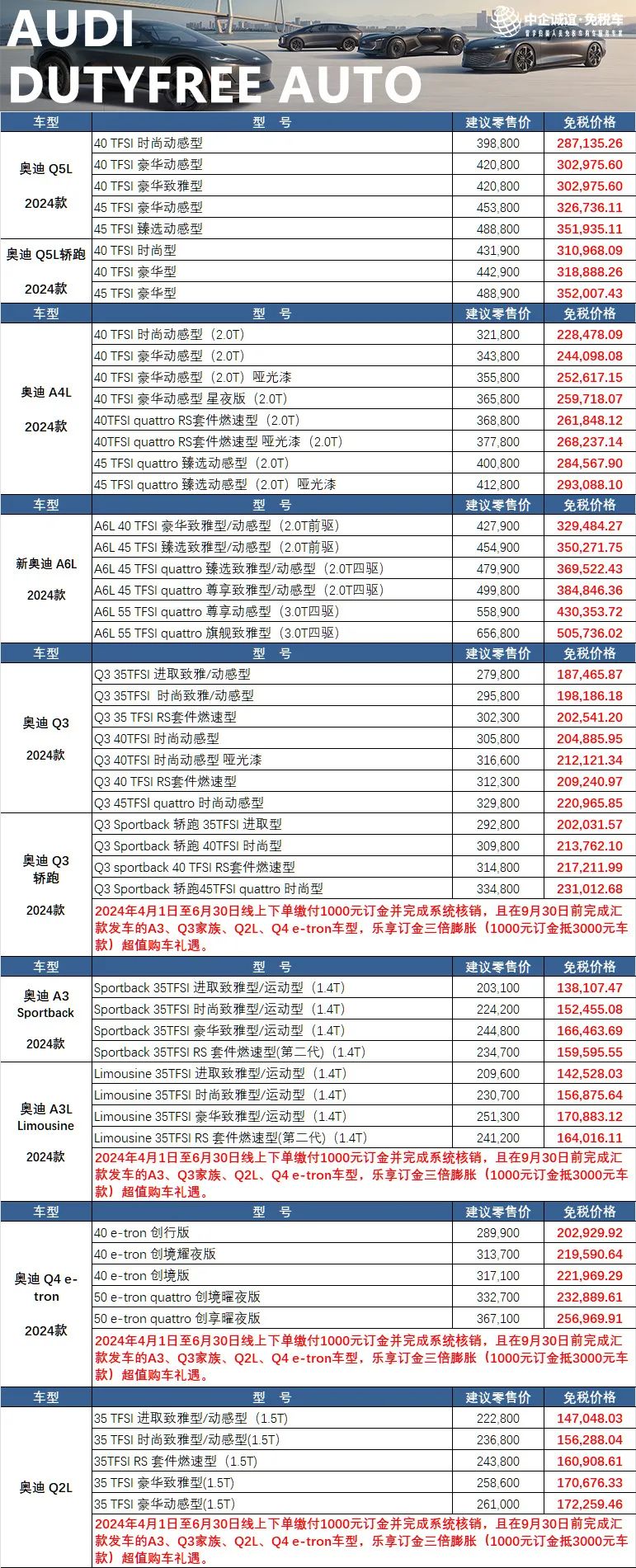 一汽奥迪各车型免税价