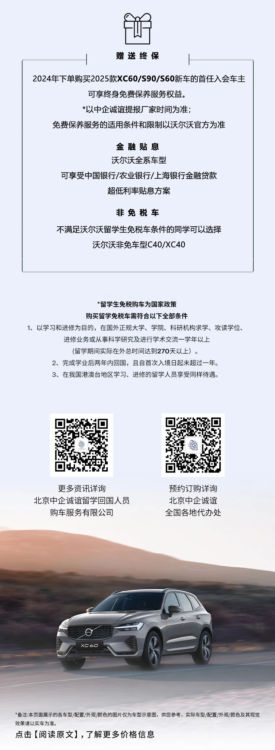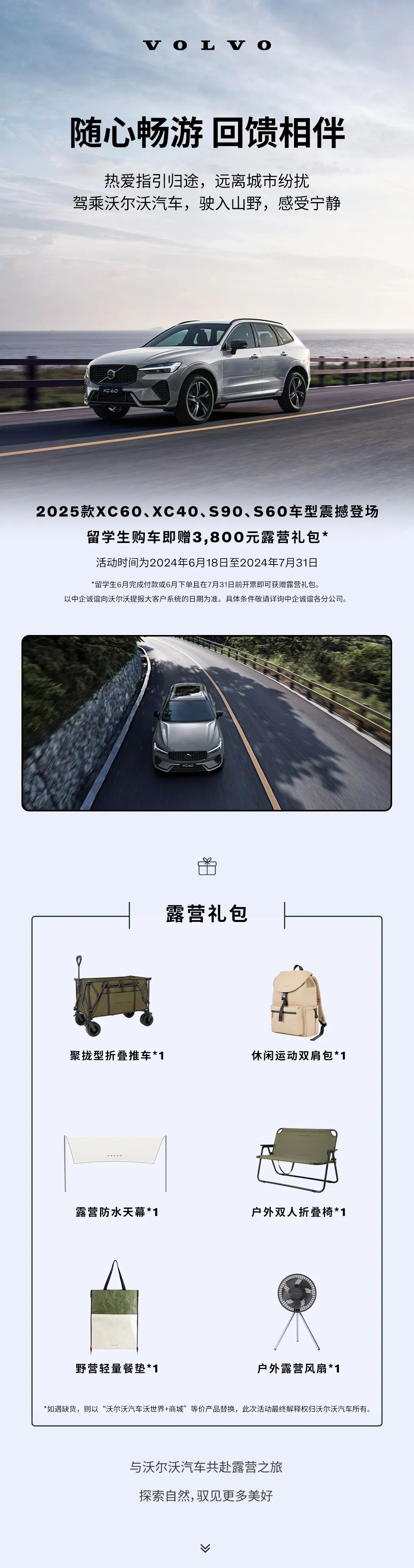 2025款沃尔沃留学生免税车继续提供终身保养(除XC40外)、低息贴息分期方案,近期购车客户还可额外赠送露营礼包六件套