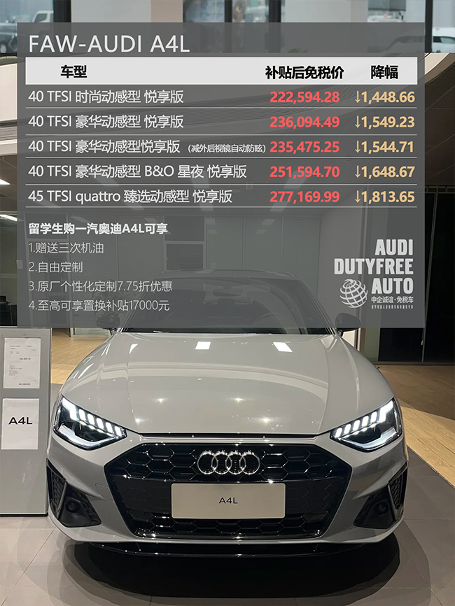 一汽奥迪第三季度留学生免税价提前放价,免税价迎来普降