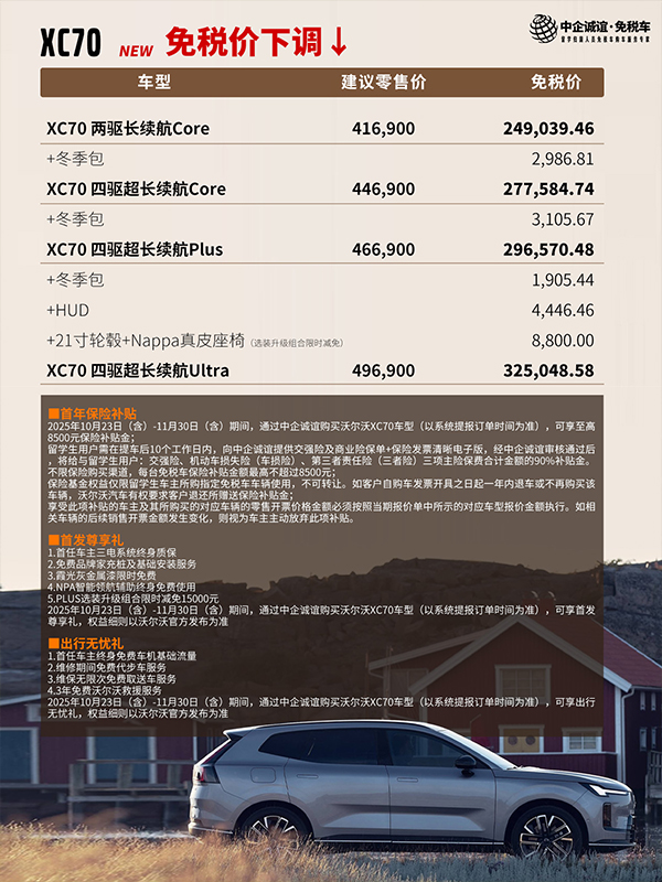 沃尔沃全新XC70基于SMA超混架构打造,CLTC纯电续航最高200km,综合续航超1200km,零百加速5.28秒。传承全域安全基因,搭载Pilot Assist与清洁座舱,2895mm轴距+1456L扩展后备箱,兼顾城市通勤与家庭出行。