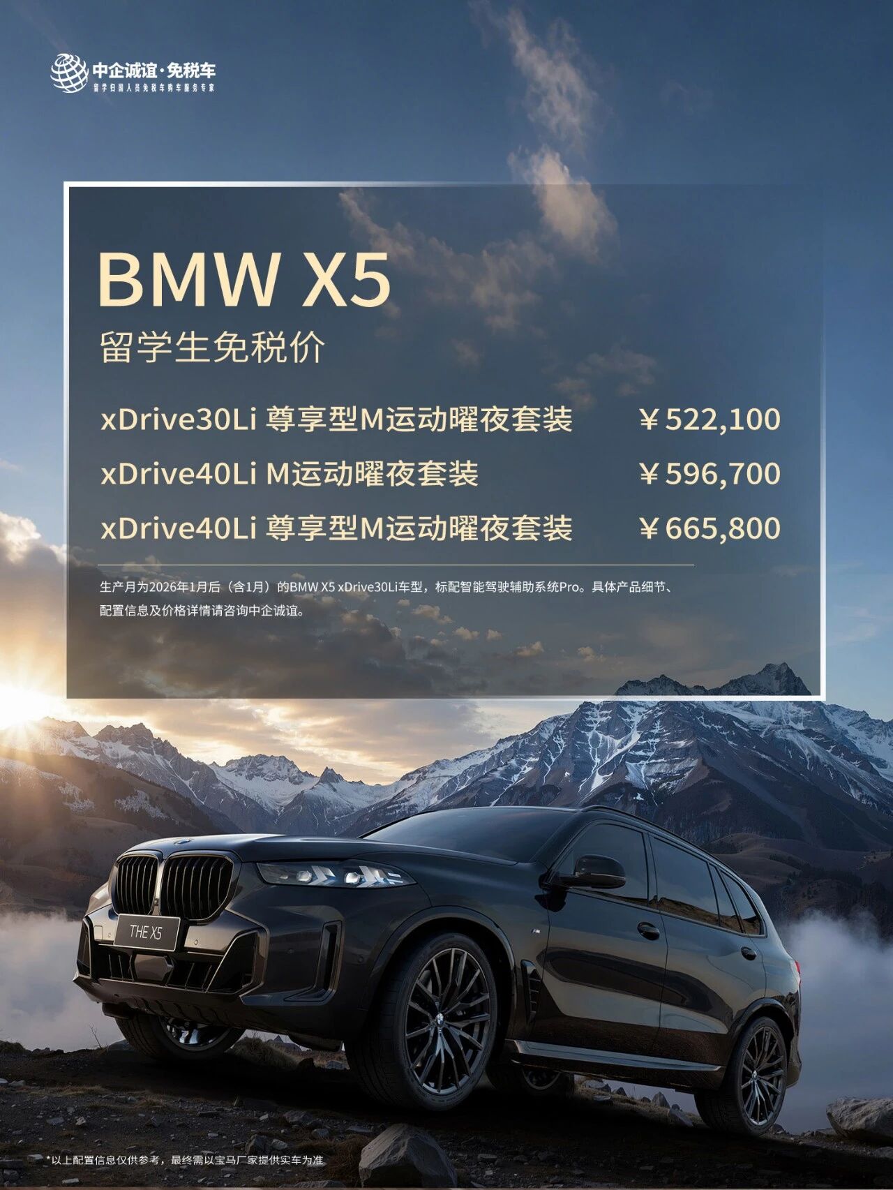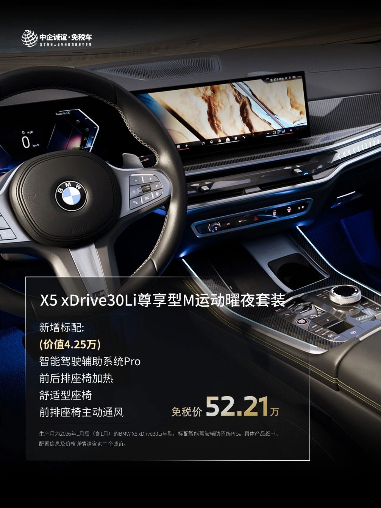 *生产月为2026年1月后(含1月)的BMW X5 xDrive30Li车型,标配智能驾驶辅助系统Pro,具体产品细节、配置信息及价格详询中企诚谊。
