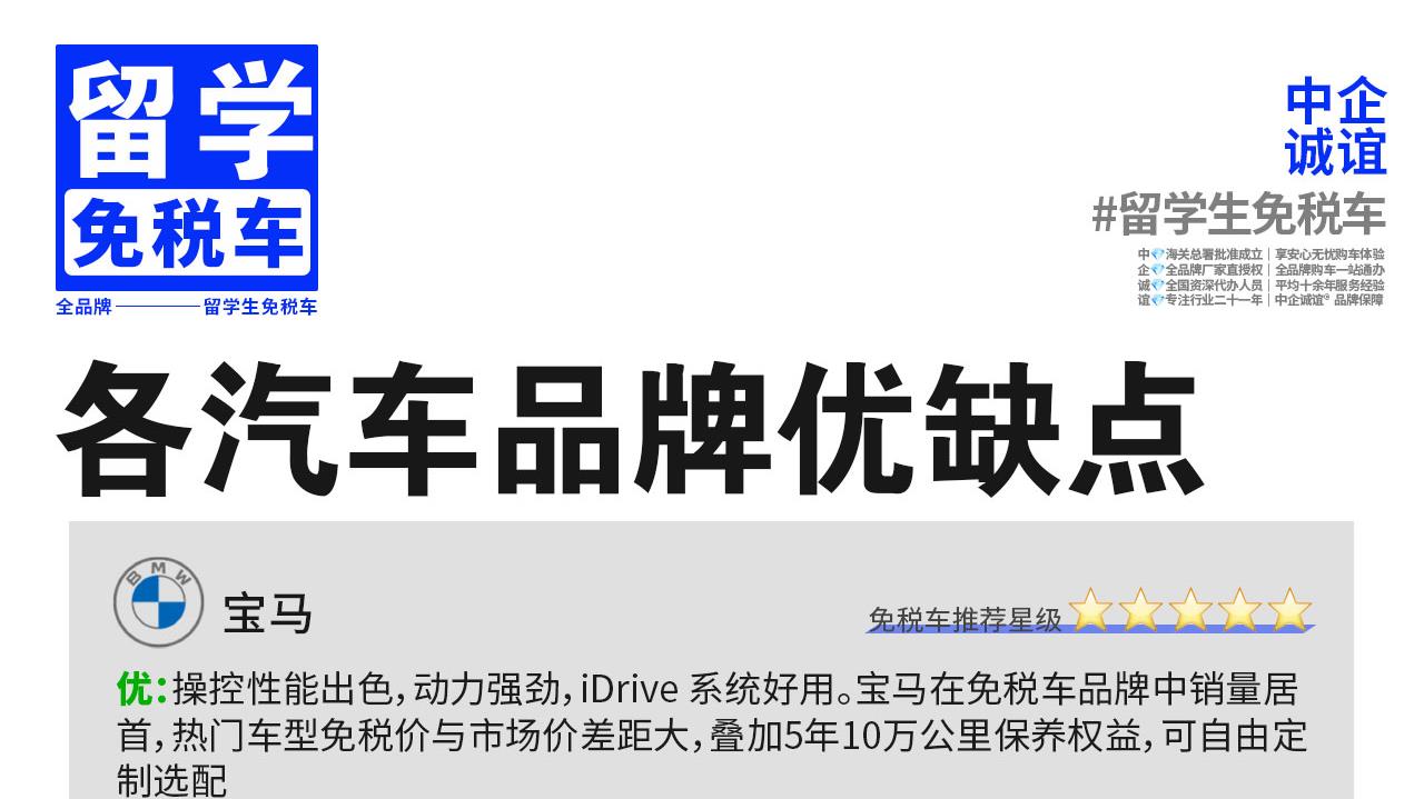 汽车品牌多到眼花缭乱?留学回国,别让好几万的留学生免税车额度打水漂!手握宝贵的免税车指标,却在BBA/沃尔沃林肯凯迪拉克/丰田本田...里疯狂纠结不知选哪个?大数据告诉你各个品牌优缺点不用盯着免税车清单疯狂挠头!宝马优:操控性能出色,动力强劲,iDrive 系统好用。宝马在免税车品牌中销量居首,热门车型免税价与市场价差距大,叠加5年10万公里保养权益,可自由定制选配缺:悬挂偏硬,个别车型外观有争议,免税车定制部分